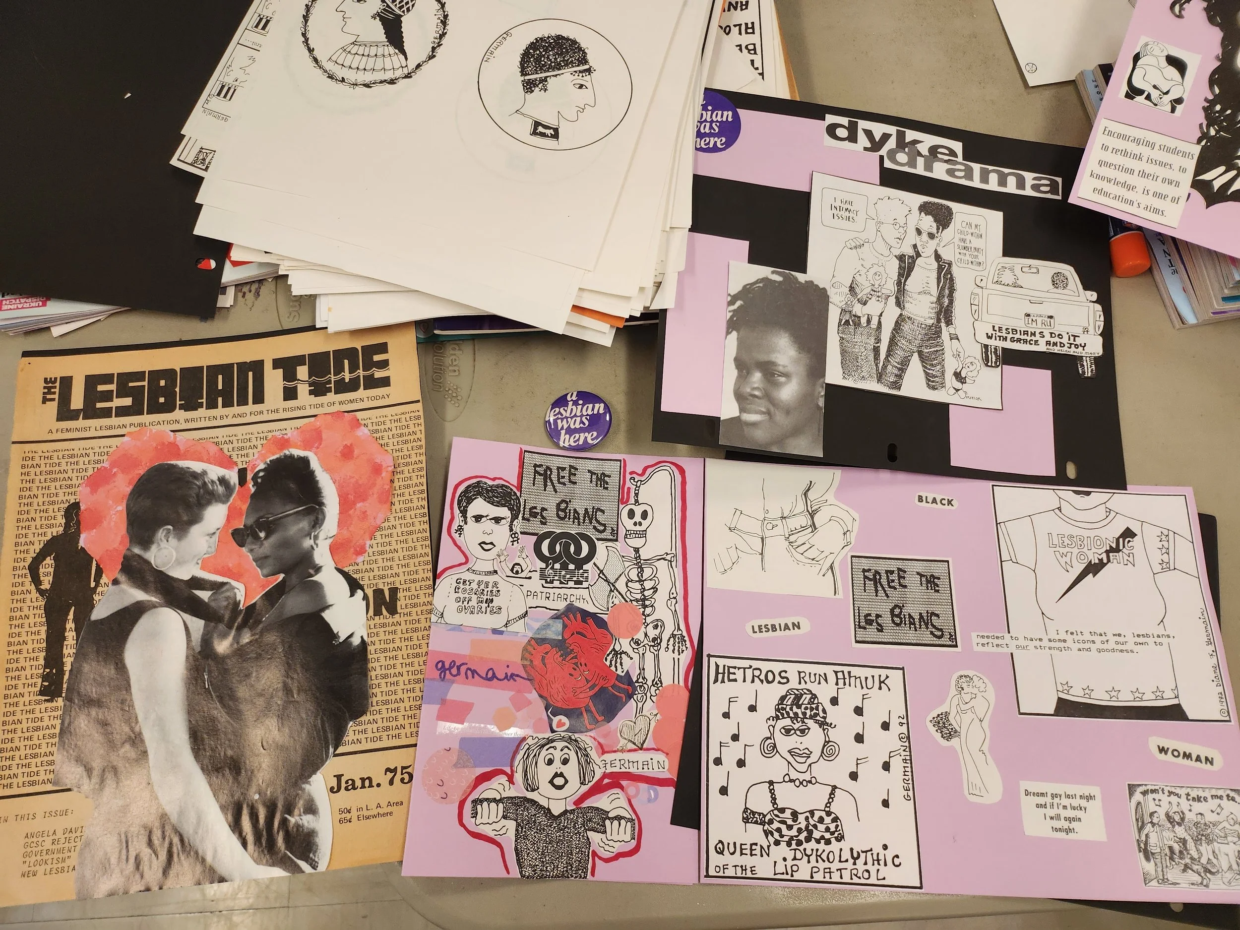 The Mazer hosted a Lesbian Comic Club event this past Sunday. We discussed a few newer lesbian focused graphic novels and crafted some collages using scrap paper and duplicates from the archive. Do you recognize any of the art? (Diane Germaine continues to be a favorite here at the archive)